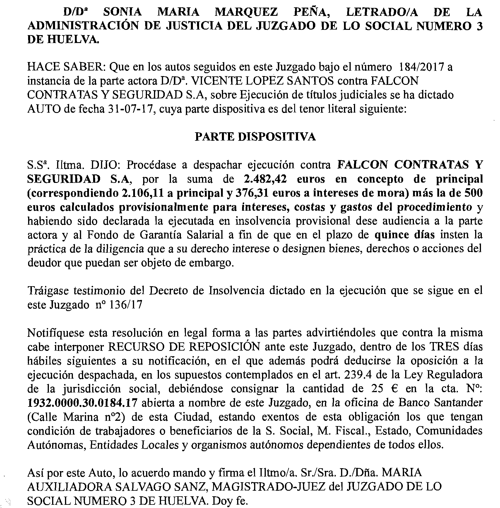 Huelva número 3. Ejecución 184 de 2017, notificación a Falcon Contratas y Seguridad, S. A.