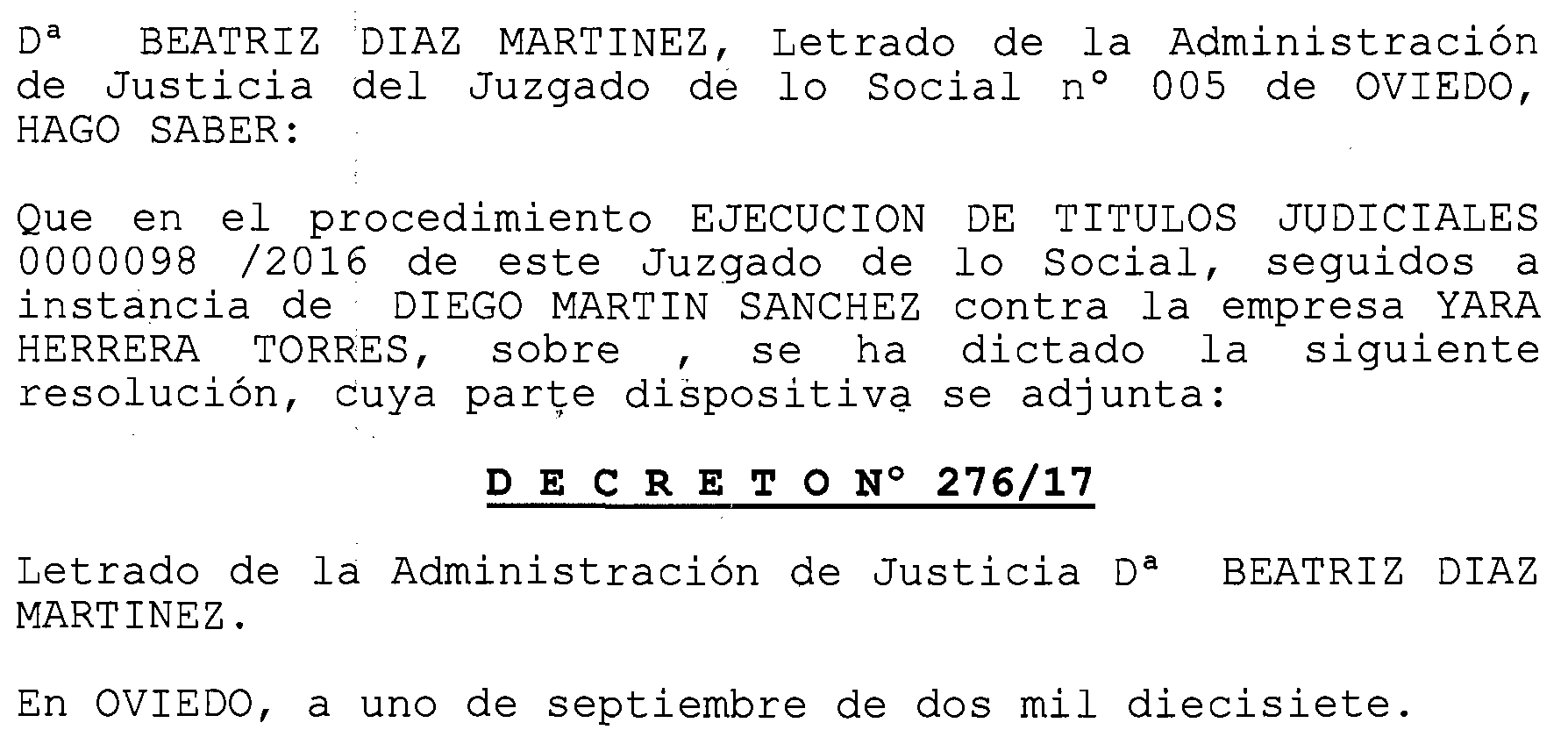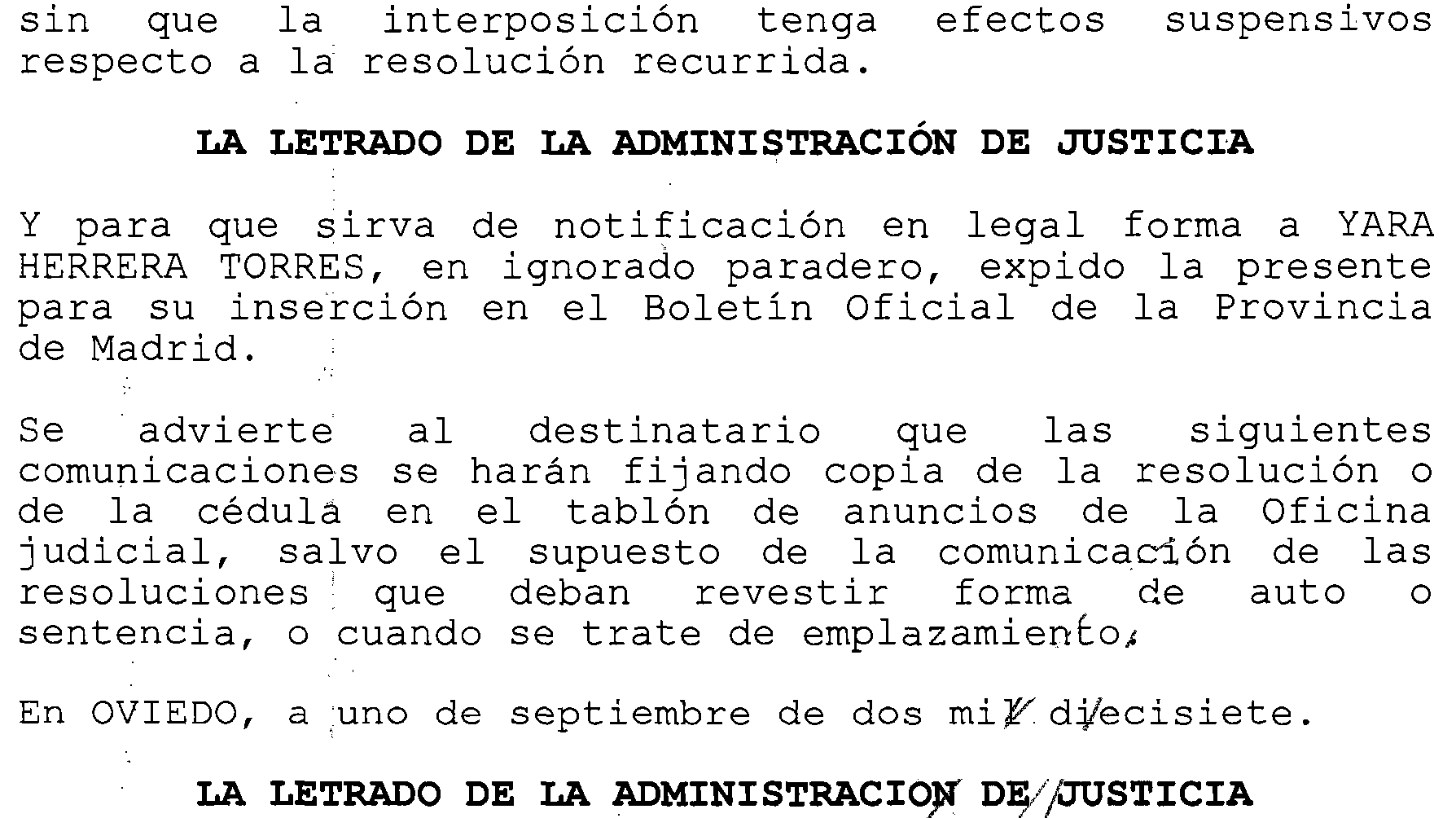Oviedo número 5. Ejecución 98 de 2016, notificación a Yara Herrera Torres