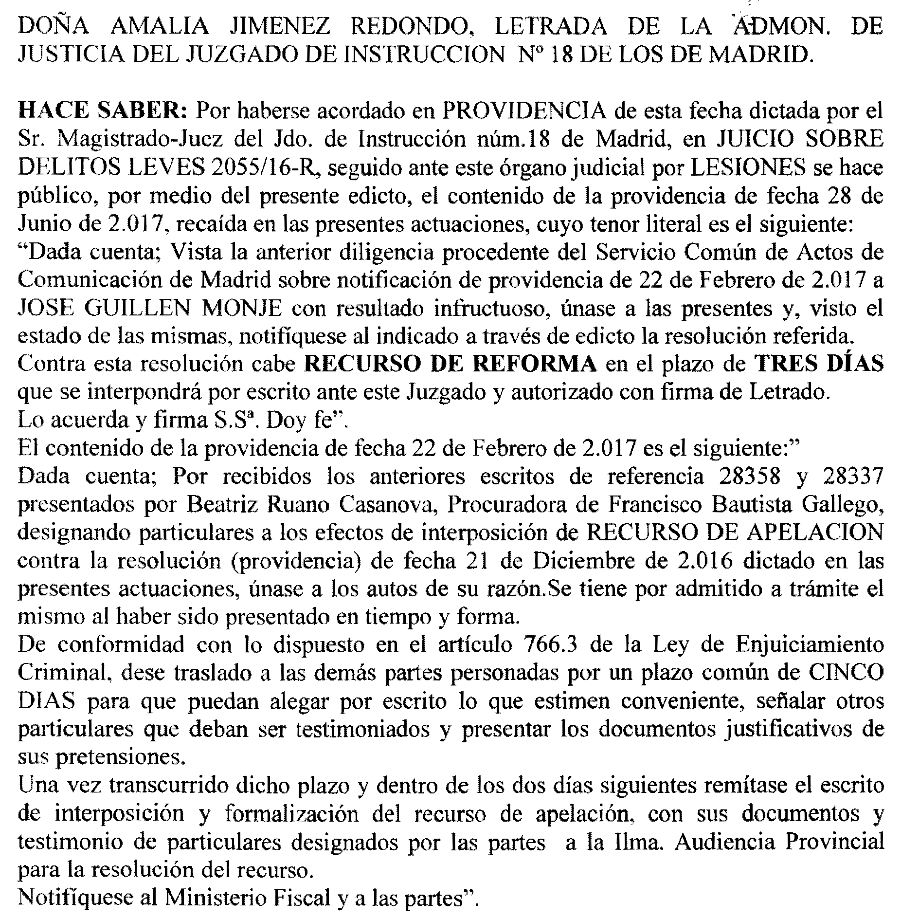 Madrid número 18. Procedimiento 2.055 de 2016, notificación a José Guillén Monje