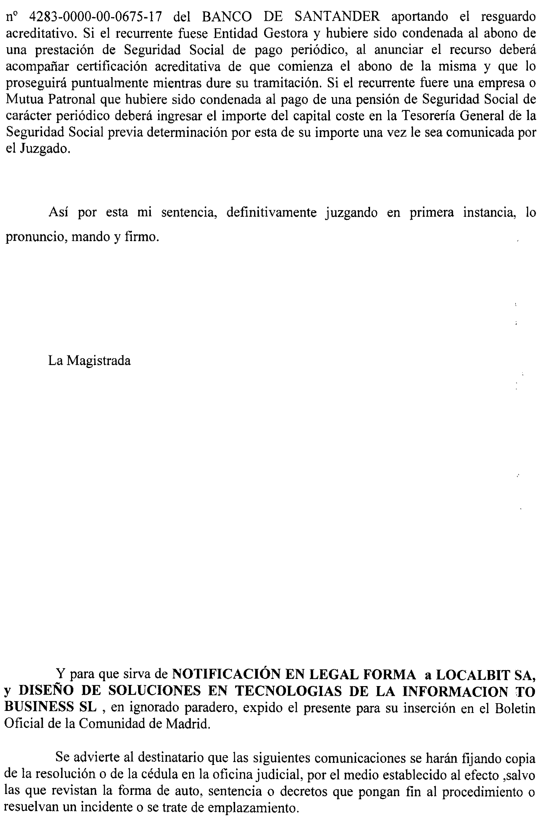 Madrid número 39. Procedimiento 675 de 2017, notificación a Localbit, S. A., y otros