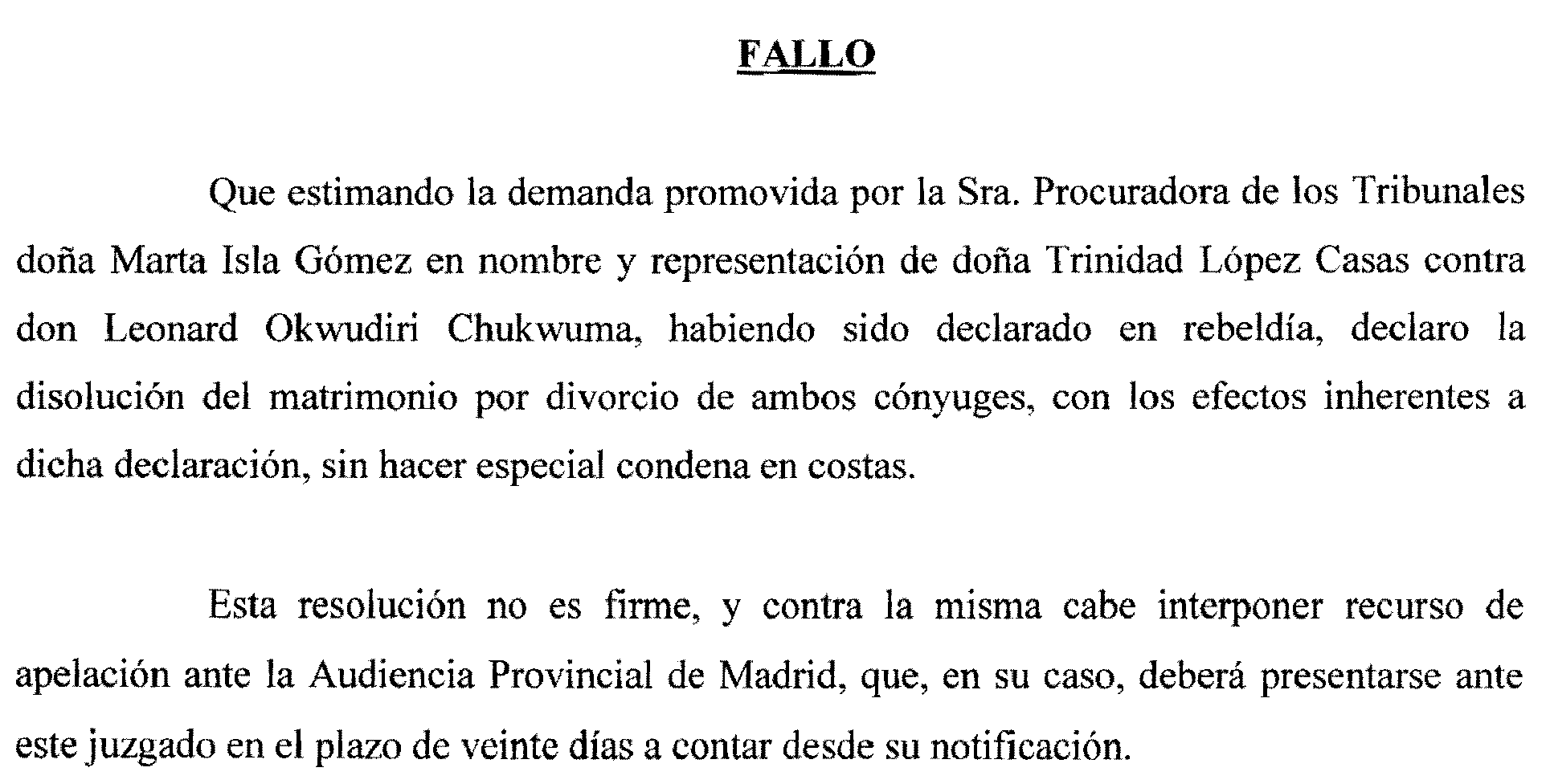 Madrid número 25. Procedimiento 47 de 2016, notificación a Leonard Okwudiri Chukwuma
