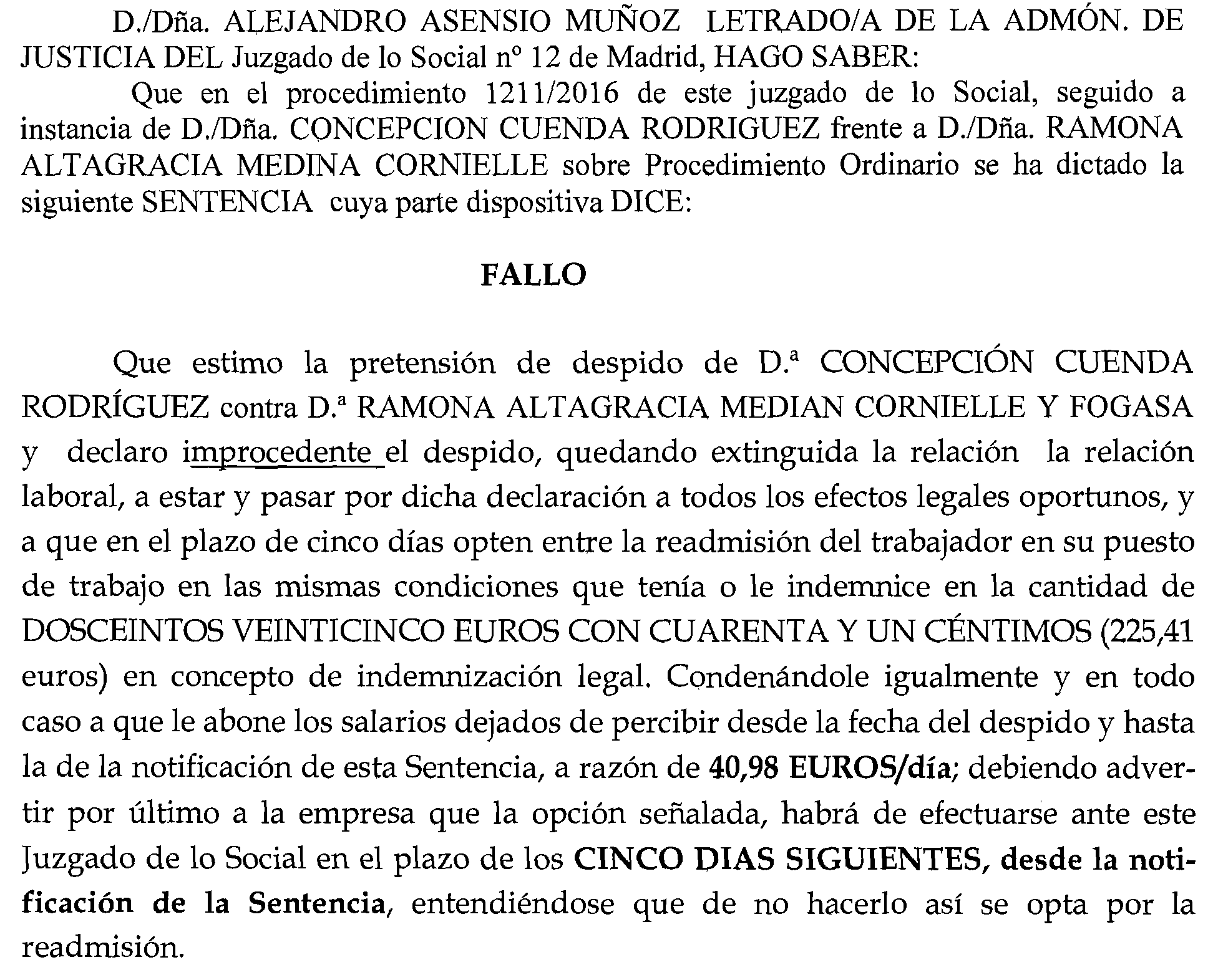 Madrid número 12. Procedimiento 1.211 de 2016, notificación a Ramona Altagracia Medina Cornielle