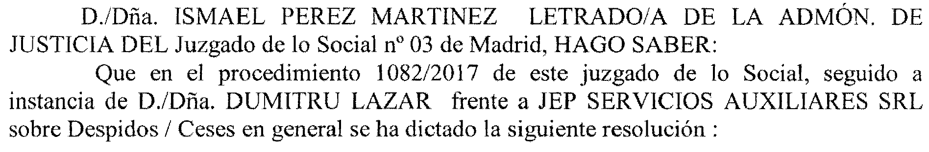 Madrid número 3. Procedimiento 1.082 de 2017, notificación a Jep Servicios Auxiliares, S. R. L.