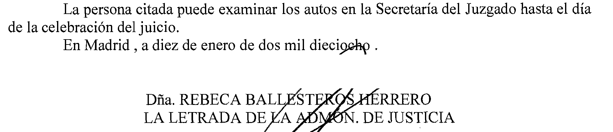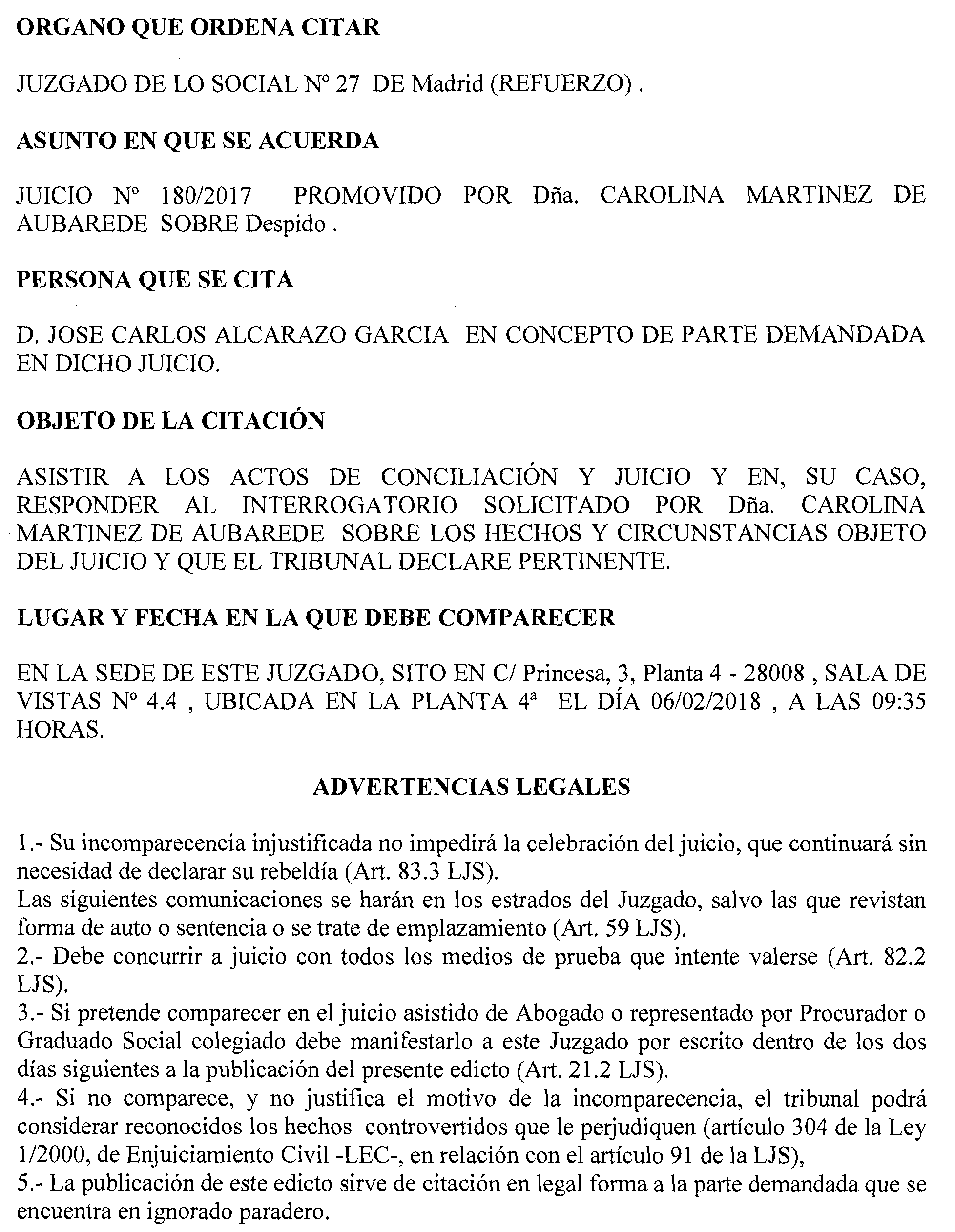 Madrid número 27. Ejecución 180 de 2017, notificación a José Carlos Alcarazo García