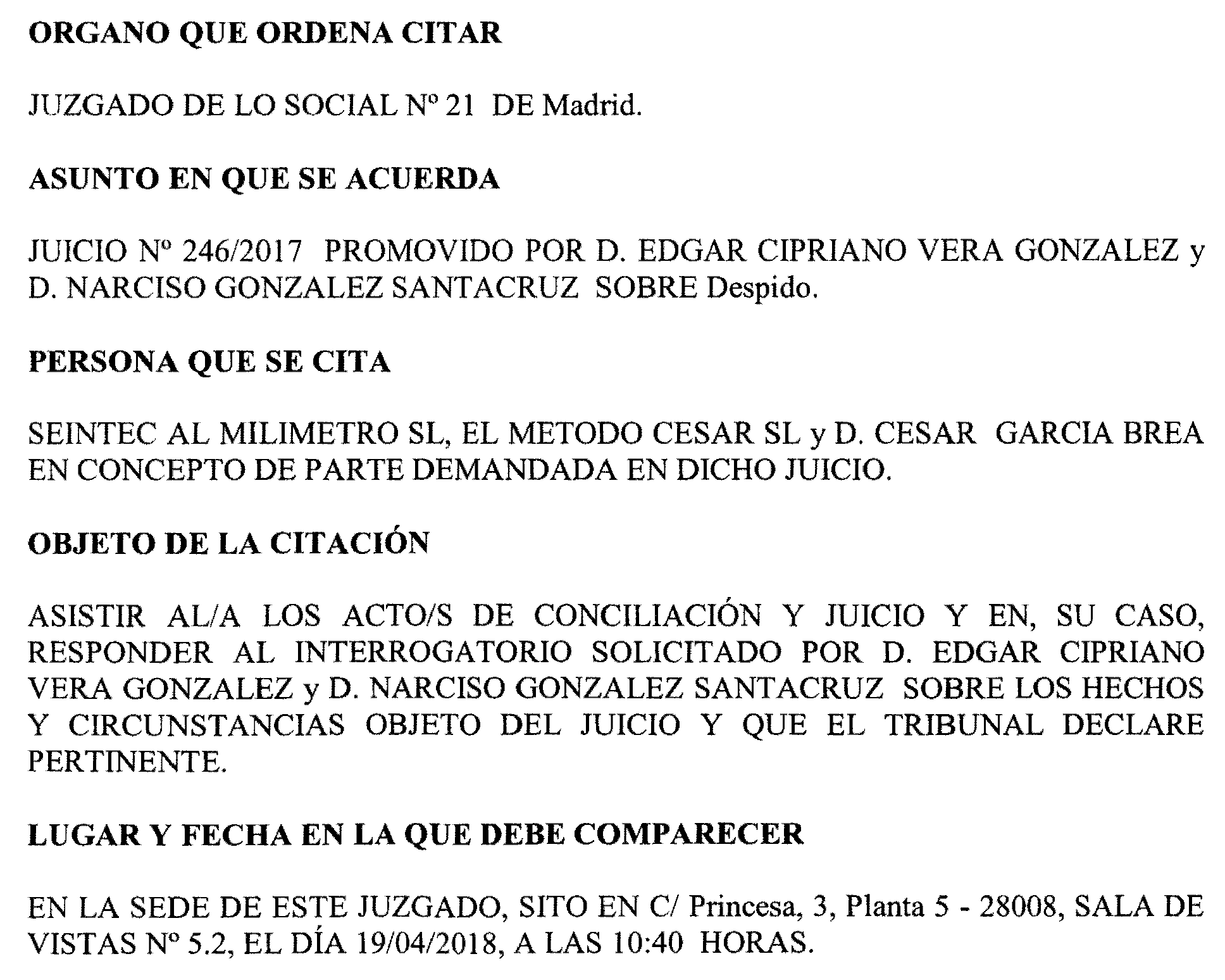 Madrid número 21. Procedimiento 246 de 2017, notificación a Seintec Al Milimetro, S. L.