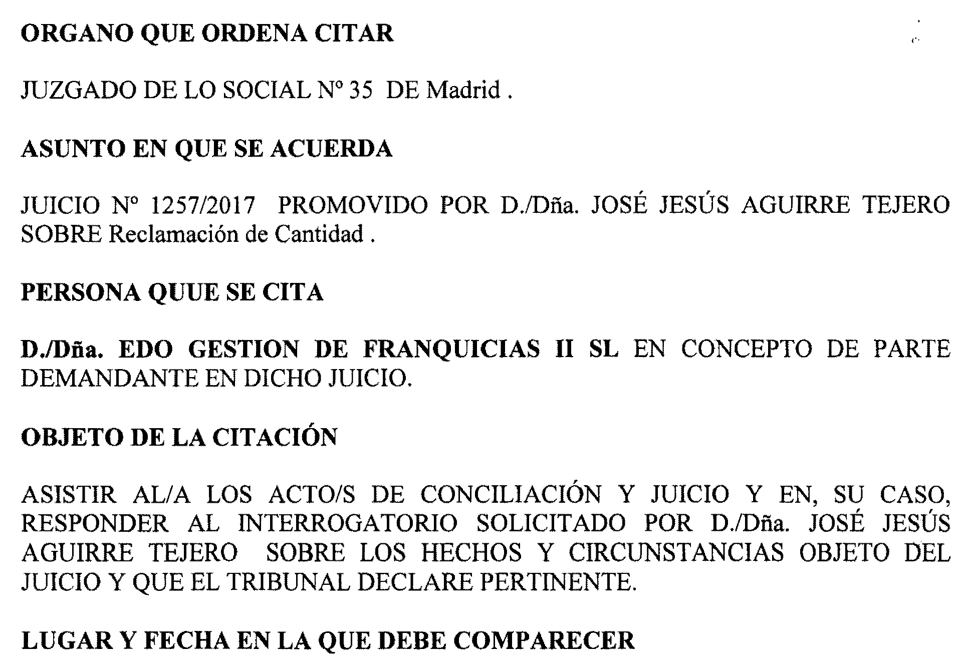 Madrid número 35. Procedimiento 1.257 de 2017, notificación a Edo Gestión de Franquicias, S. L.