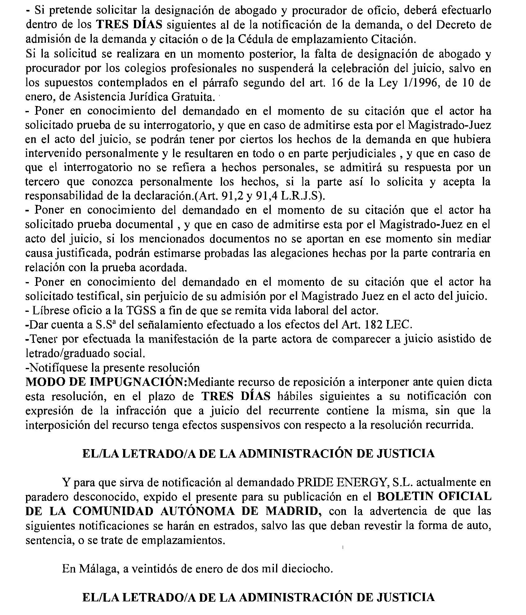 Málaga número 11. Procedimiento 1.031 de 2017, notificación a Pride Energy, S. L.