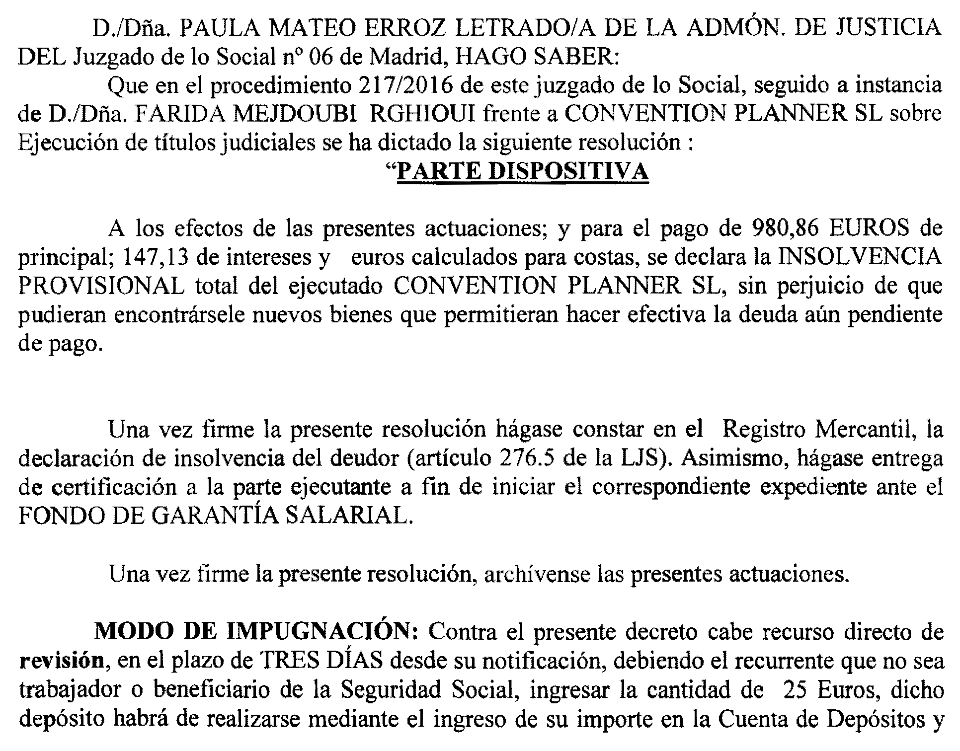 Madrid número 6. Ejecución 217 de 2016, notificación a Convention Planner, S. L.