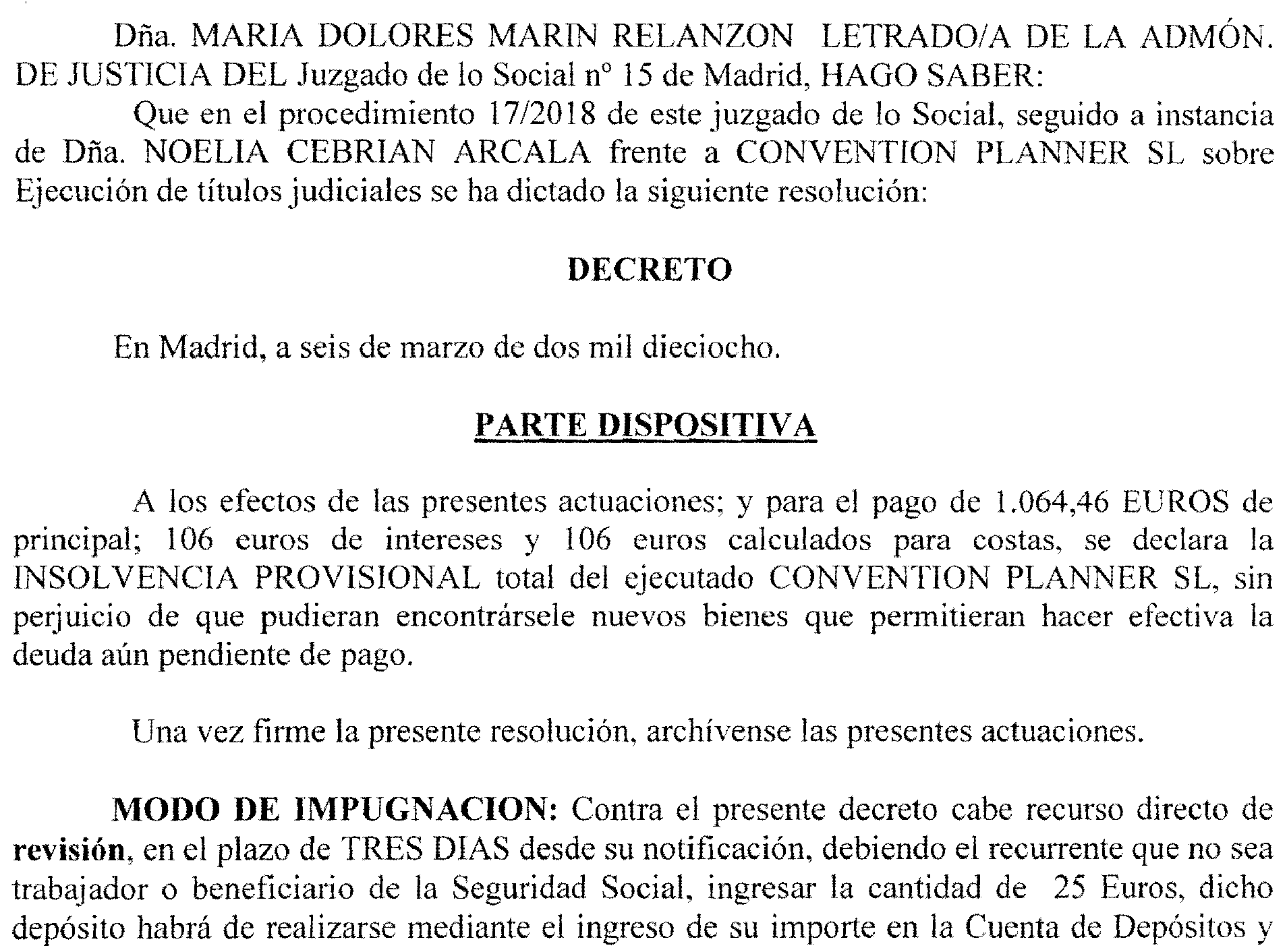 Madrid número 15. Ejecución 17 de 2018, notificación a Convention Planner, S. L.