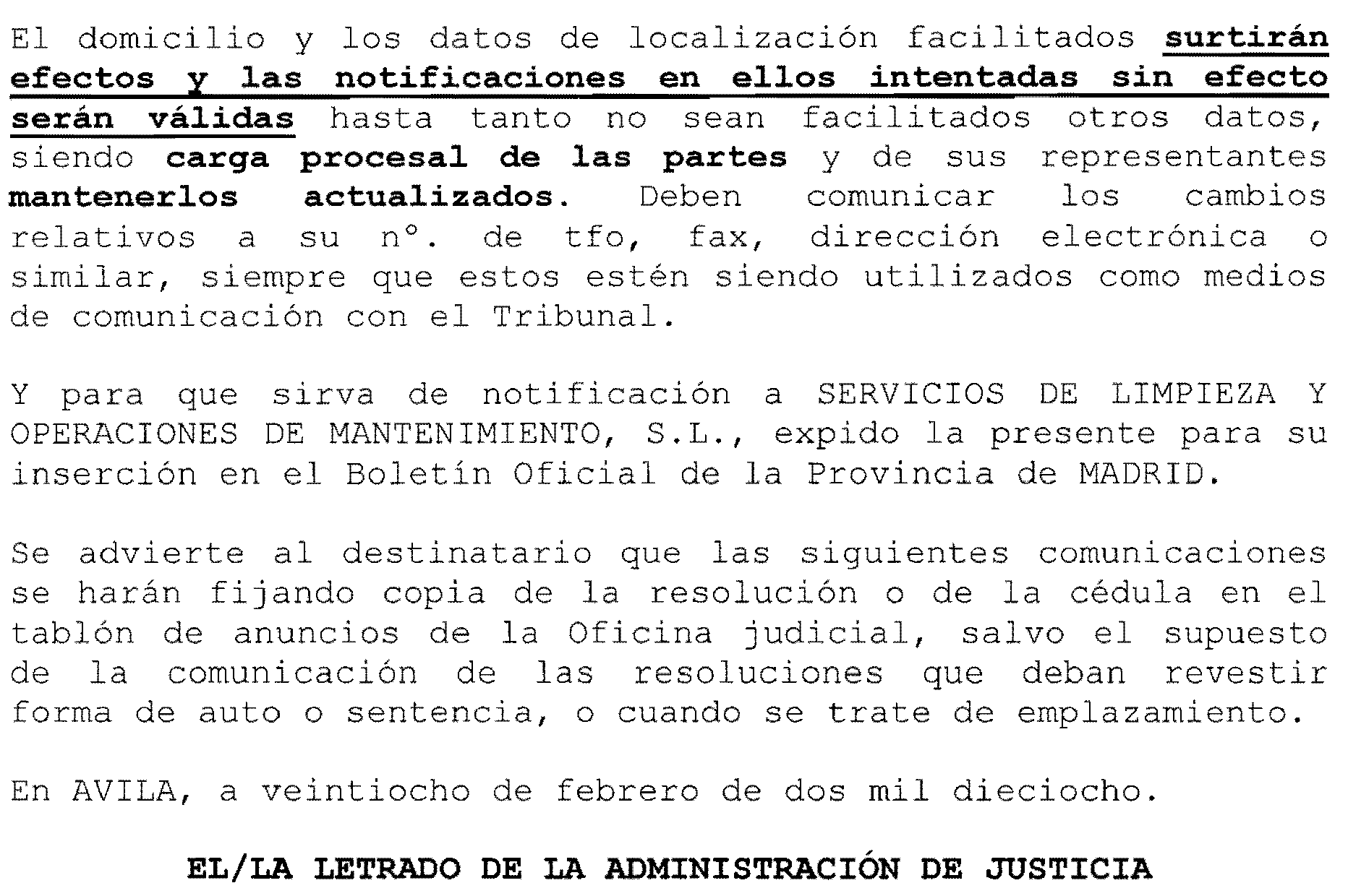Ávila número 1. Ejecución 50 de 2018, notificación a Servicios de Limpieza y Operaciones de Mantenimiento, S. L.