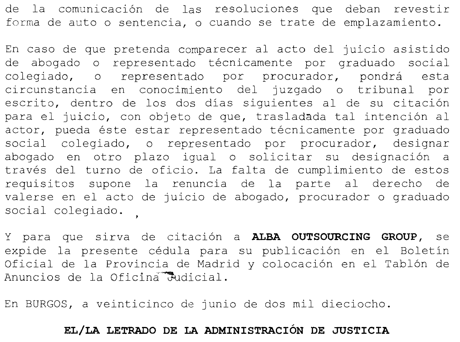 Burgos número 3. Procedimiento 690 de 2017, notificación a Alba Outsourcing Group