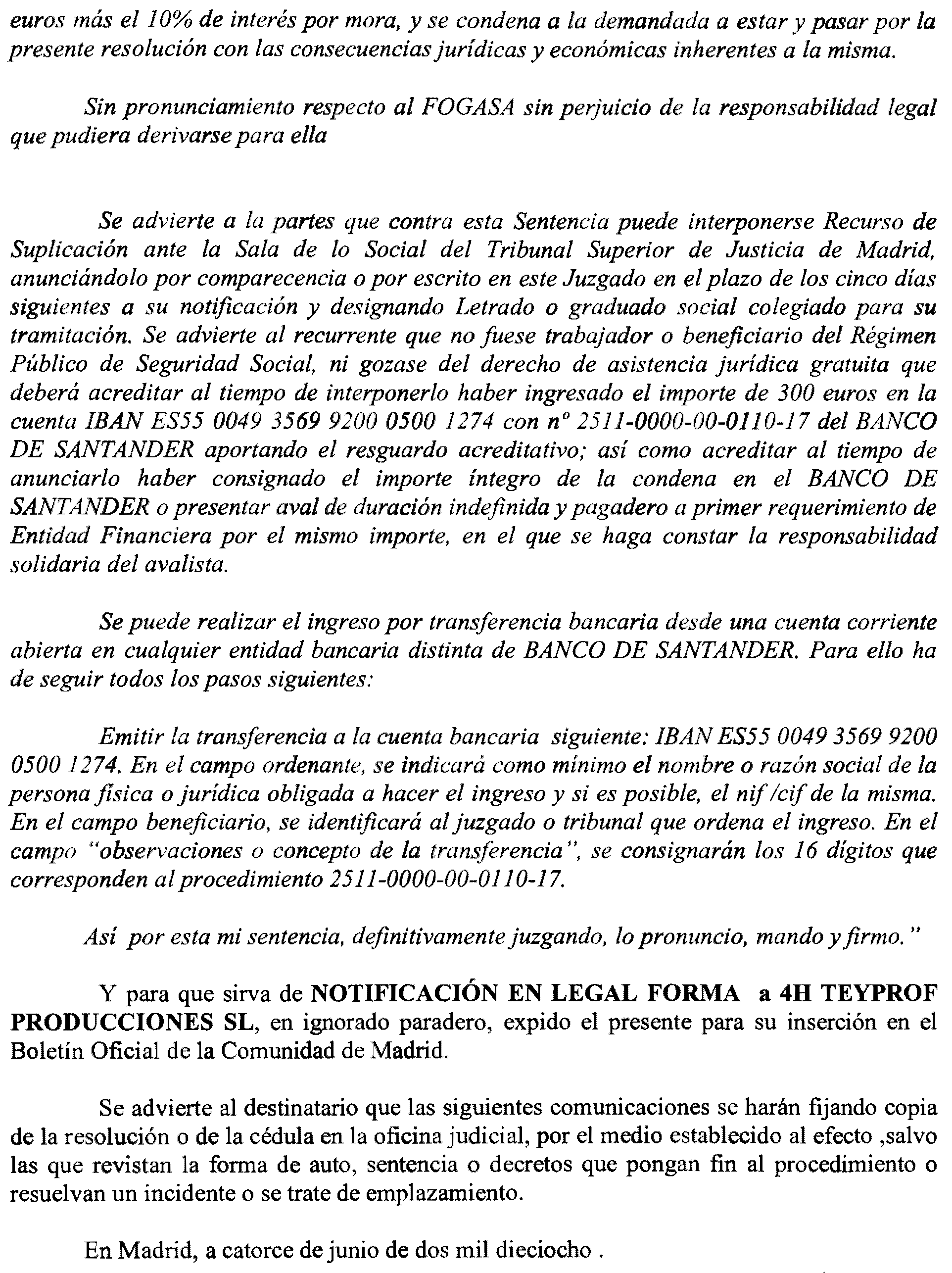 Madrid número 13. Procedimiento 110 de 2017, notificación a 4H Teyprof Producciones, S. L.