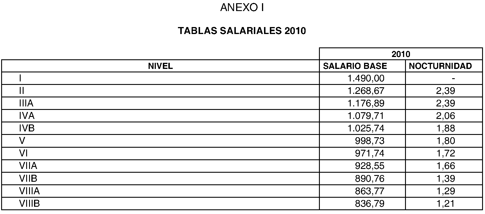 Las tablas salariales correspondientes a 2010, 2011 y 2012 son las que se detallan en el Anexo I, II y III.