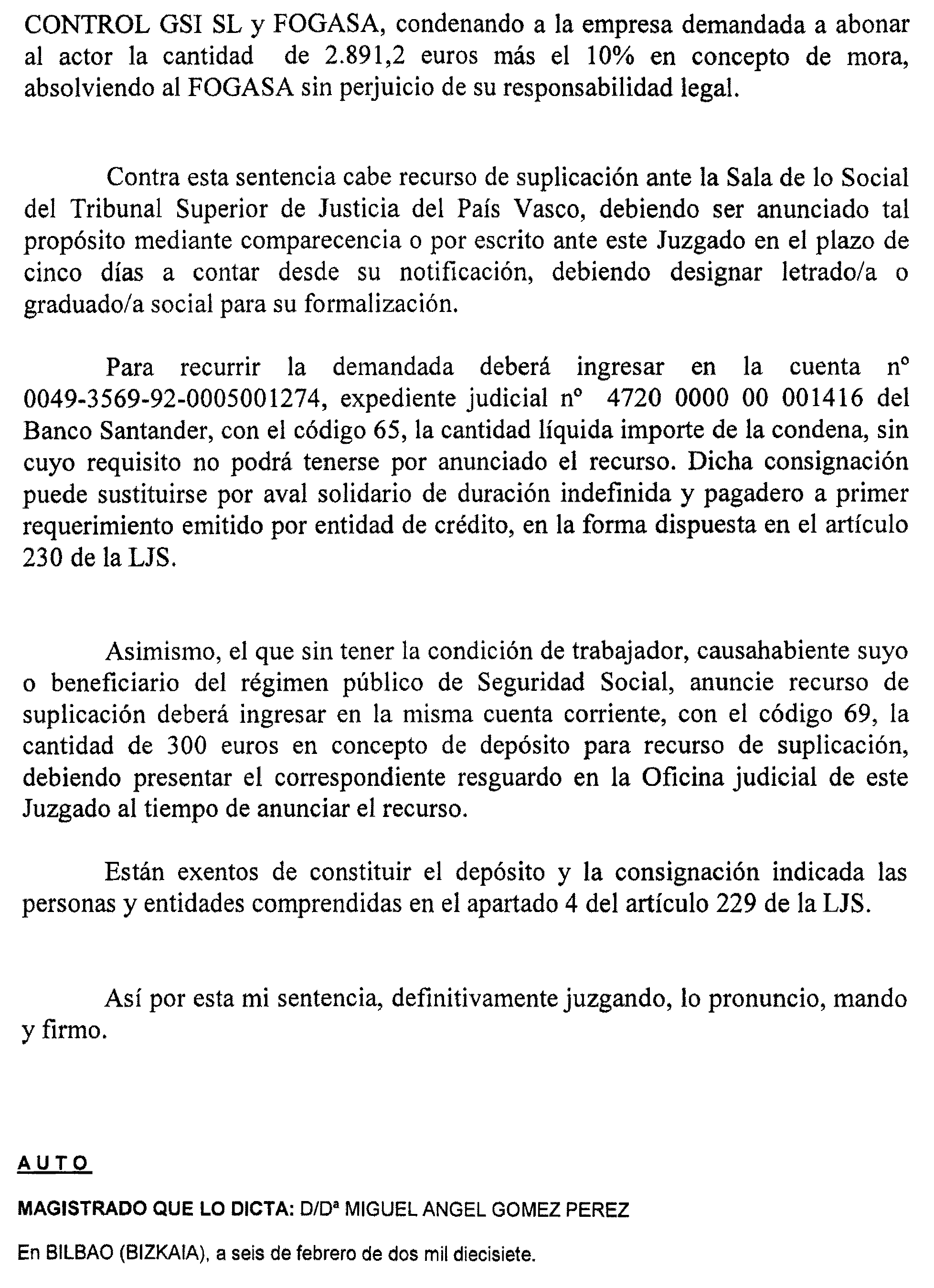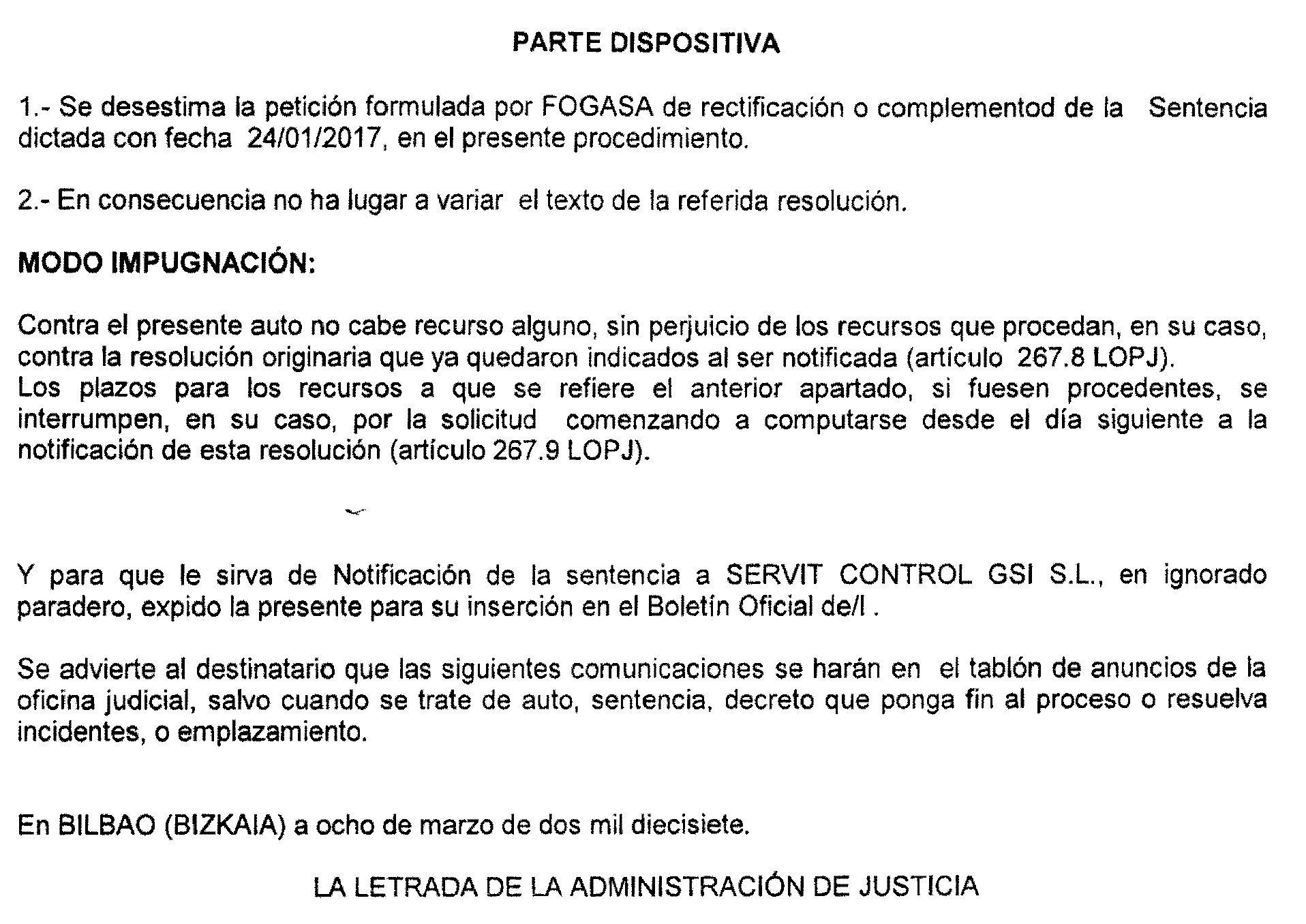 Bilbao número 4. Procedimiento 14 de 2016, notificación a Servit Control GSI, S. L.