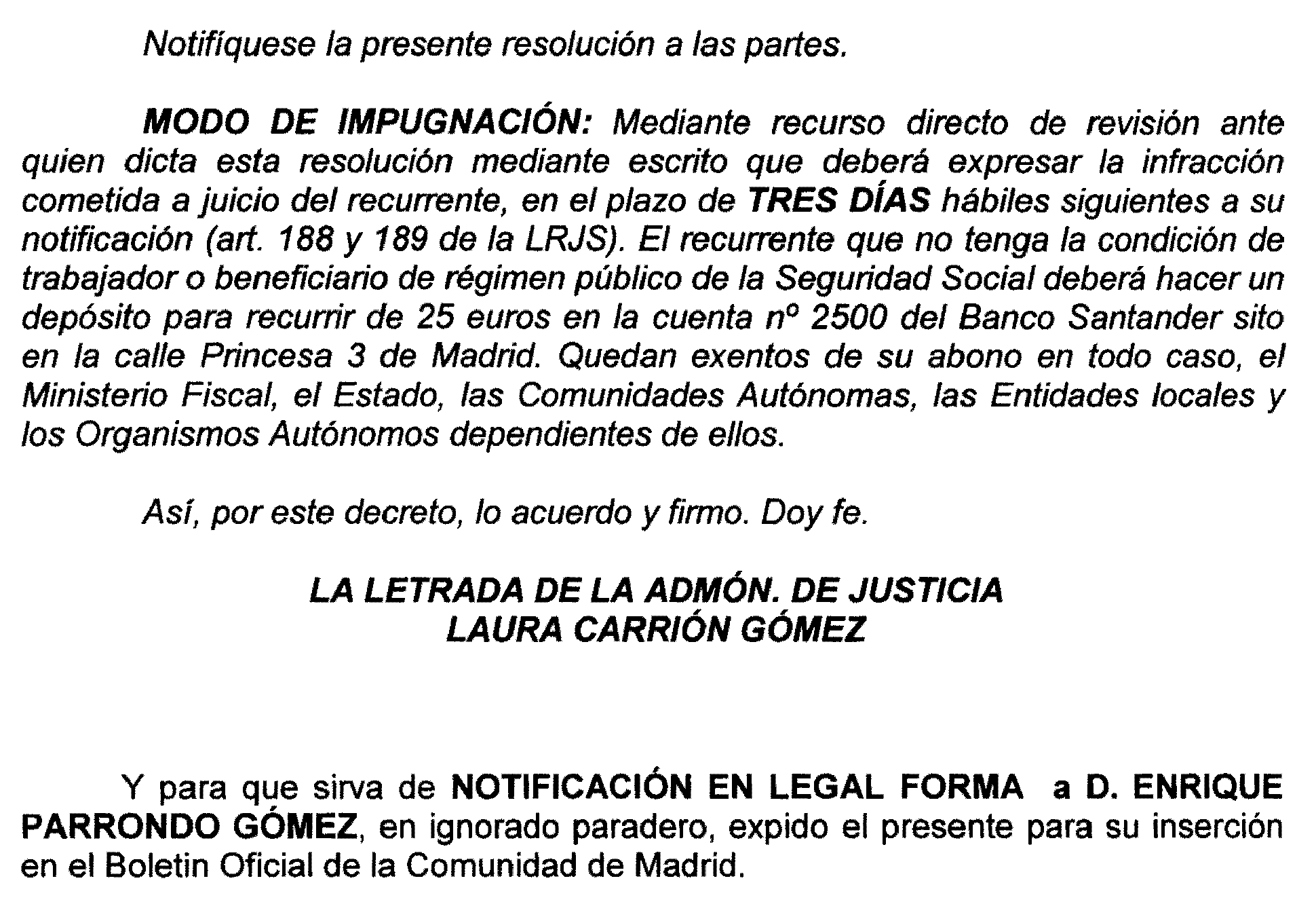 Madrid número 2. Ejecución 67 de 2017, notificación a Enrique Parrondo Gómez
