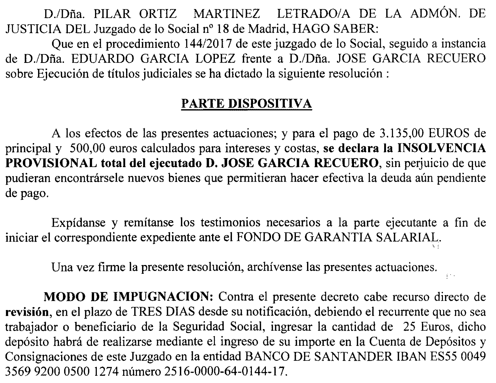Madrid número 18. Ejecución 144 de 2017, notificación a José García Recuero
