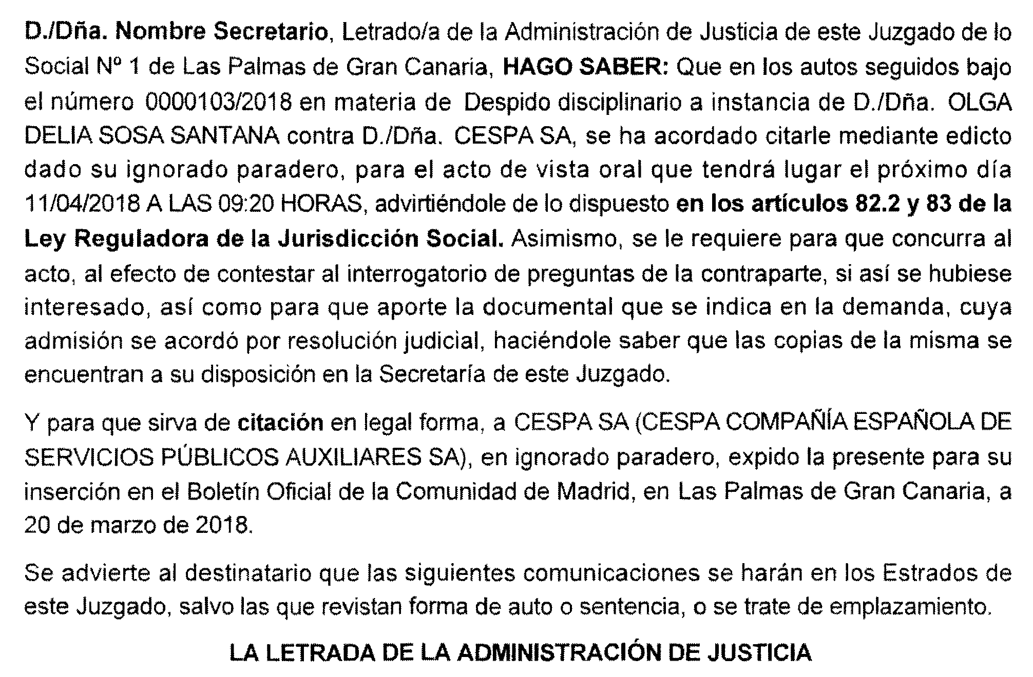 Las Palmas de Gran Canaria número 1. Procedimiento 103 de 2018, notificación a Cespa, S. A.
