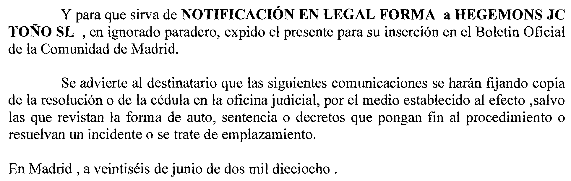 Madrid número 8. Procedimiento 1.032 de 2017, notificación a Hegemons JC Toño, S. L.