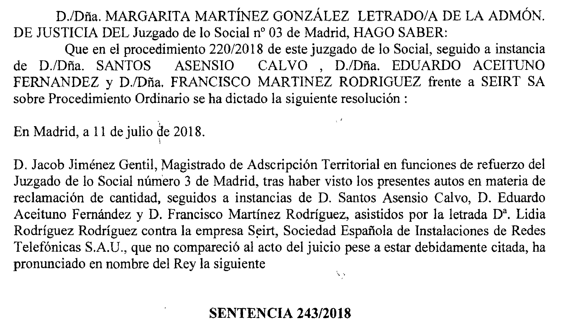 Madrid número 3. Procedimiento 220 de 2018, notificación a Seirt, S. A.